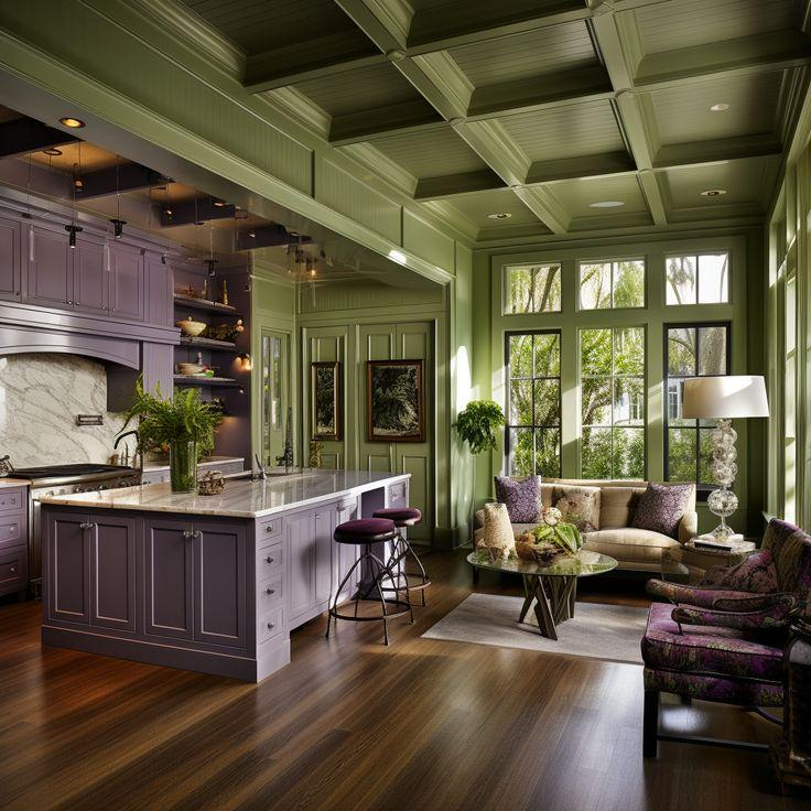 This unexpected plum colour combination draws from nature. Olive green (3604 Fern Frond) softens plum’s (3287 Royal Chronicle) intensity and brings an earthy touch to the room.